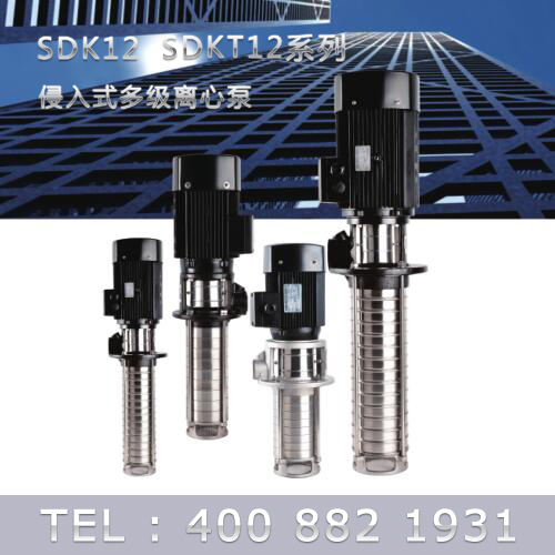 SDK12/SDKT12為配用標準電機的非自吸立式多級離心泵,電機軸和泵軸用聯(lián)軸器直接聯(lián)接的結(jié)構(gòu)。為滿足水槽或容器的安裝深度,可安裝空套的腔體來改變泵本身的侵入 深度。
